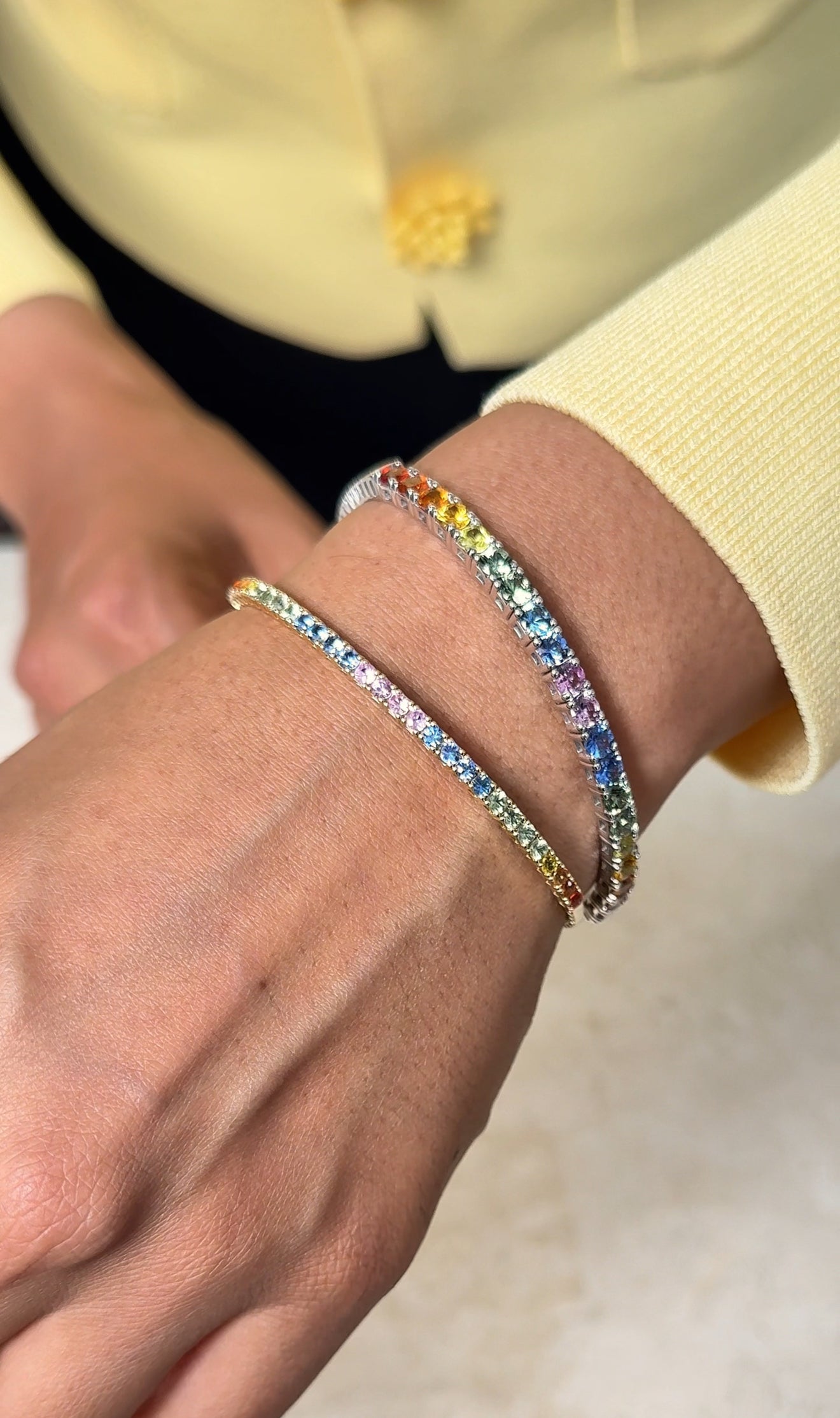 A vibrant reimagining of a timeless classic, the Rainbow Sapphire Flex Bangle infuses joyful color into a sleek and versatile design. Handcrafted in 14K yellow gold and set with 2.36 carats of natural multi-colored sapphires, this bracelet celebrates the beauty of every shade—from radiant blues and pinks to golden yellows and lush greens.
