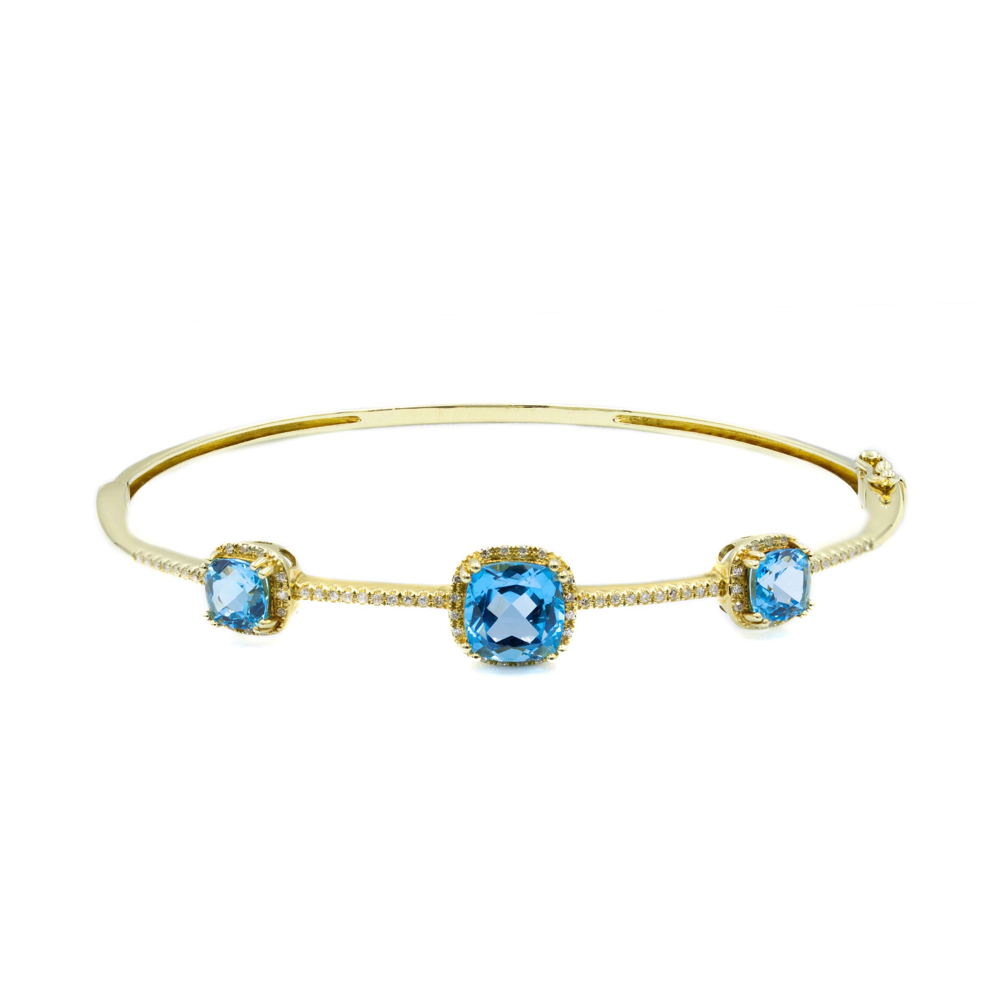 Radiant and refined, this striking bangle features three cushion-cut blue topaz gemstones, totaling 3.68 carats, their vivid sky-blue hue framed by a halo of sparkle. Accented with 0.24 carats of natural pavé-set diamonds in GH SI quality, the design balances brilliance with timeless sophistication.