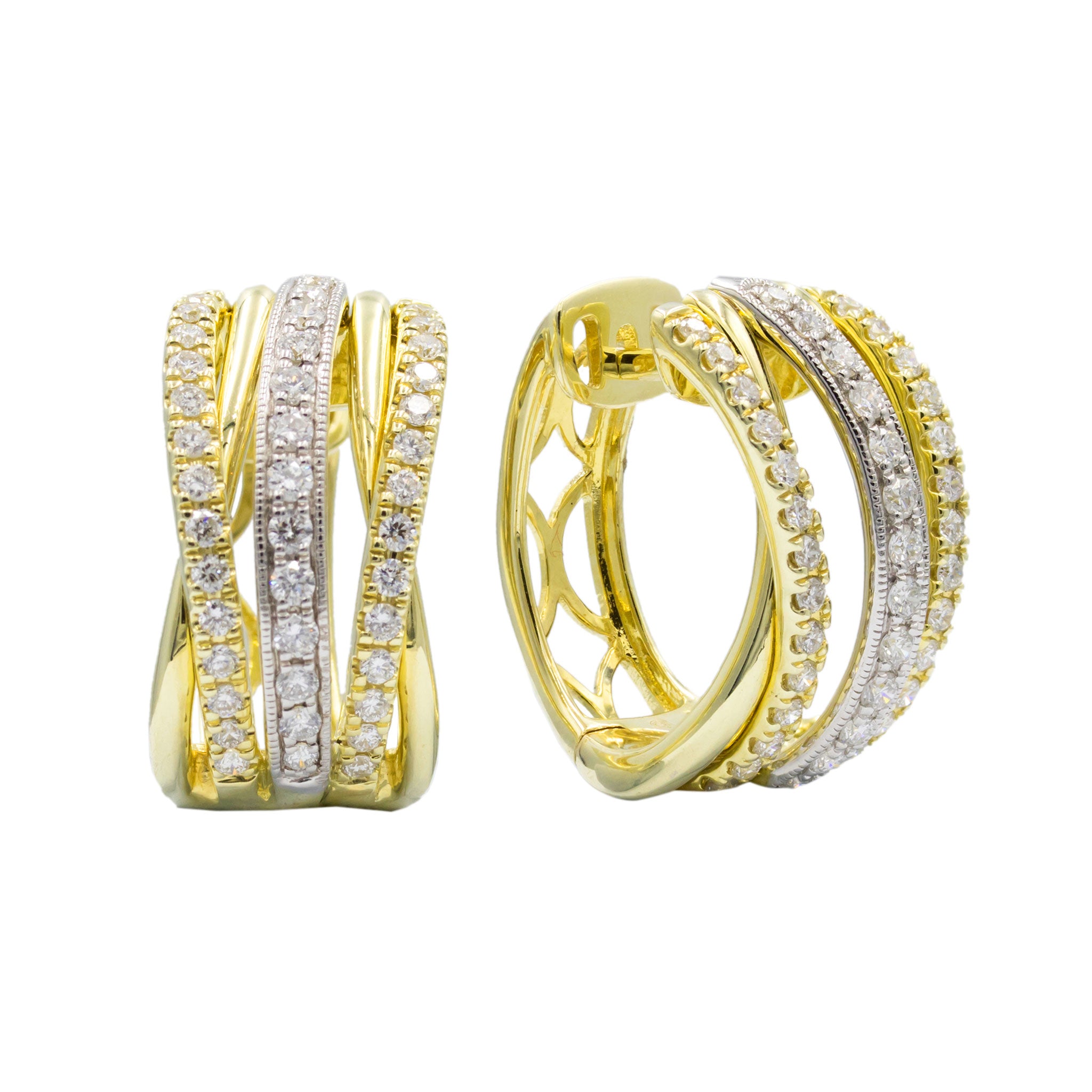 Sophisticated yet playful. These two-tone crossover hoops intertwine bands of yellow and white gold, each row accented with natural diamonds totaling 0.92ct. With a secure click closure, they’re versatile, chic, and add sparkle to every occasion.