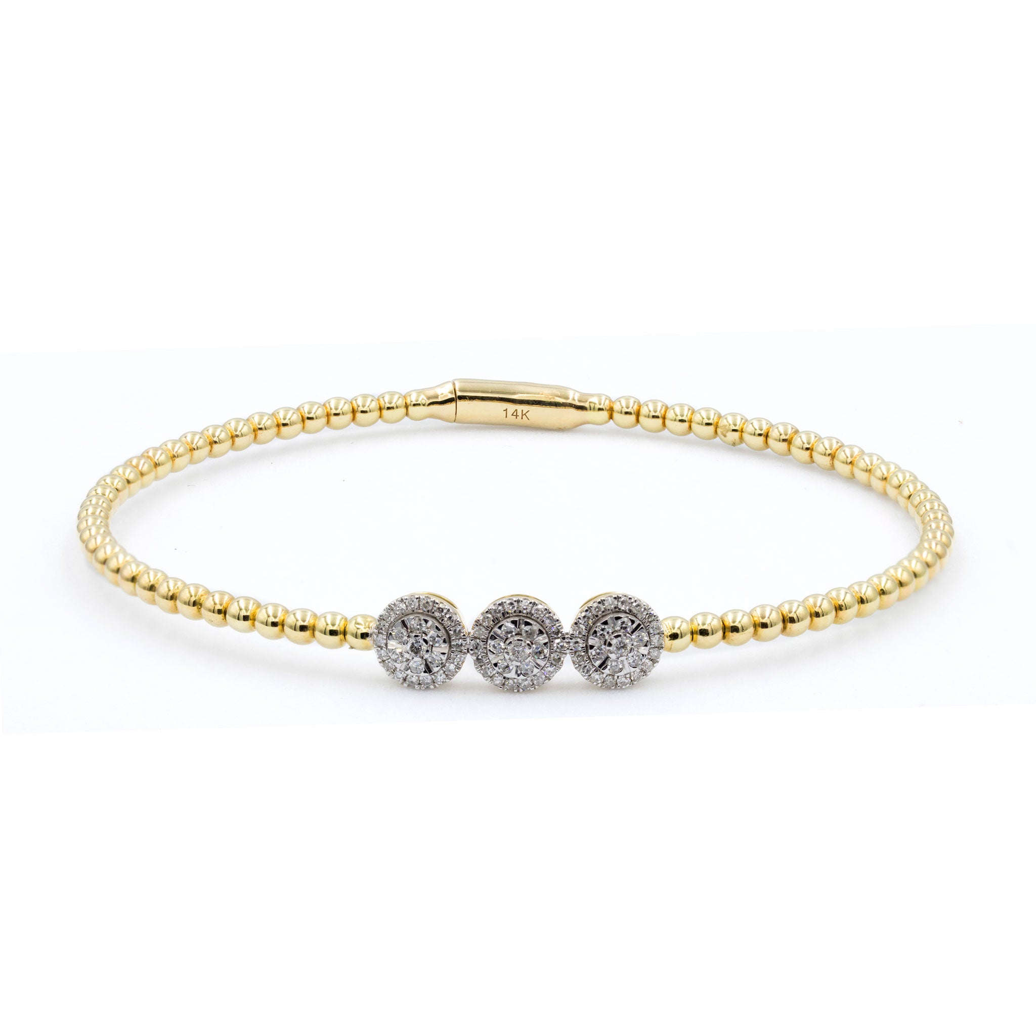 Graceful and eye-catching, the Trio Radiance Diamond Bangle adds a touch of brilliance to every look. Crafted in 14K yellow gold, its polished beaded design is accented with three diamond clusters totaling 0.30 carats, each framed in a delicate halo that enhances their sparkle.