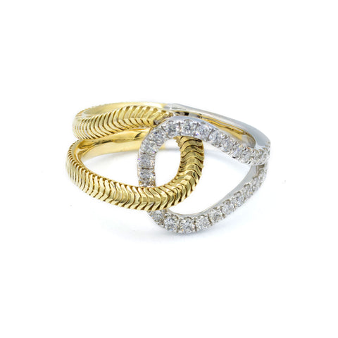 A sculptural symbol of connection and strength. This intertwined ring unites two textures — high-polish yellow gold and pavé-set white diamonds — for a piece that’s both modern and timeless....