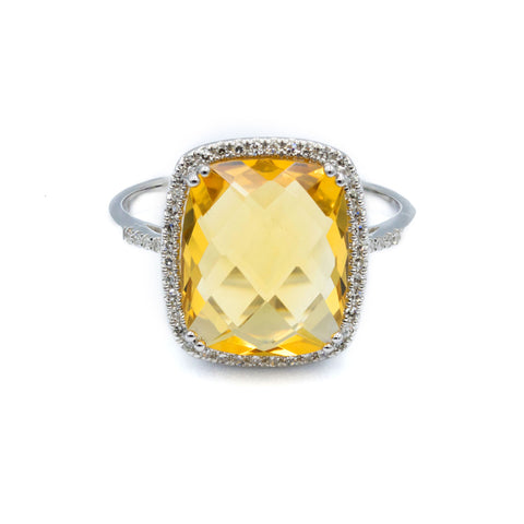 Pure sunshine on your hand. This striking ring features a 4.82ct cushion-cut citrine, framed with 48 natural diamonds for a subtle halo of sparkle. Set in polished 14k white gold,...