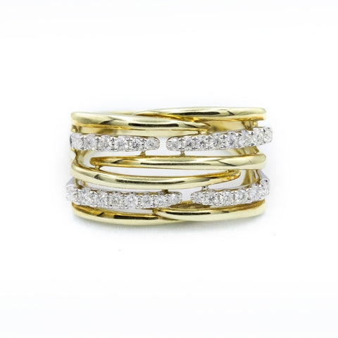 Stacked perfection in one design. This 14k yellow gold ring is crafted with multiple interlaced bands, highlighted by 28 diamonds totaling 0.33ct. Chic, bold, and versatile, it’s the ring that...